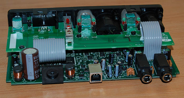 To get the front faceplate off, pull off the knobs and unscrew the speed nut on the monitor knob shaft. Each XLR has a screw at the top inside to be removed. Flip everything over and also take out the two screws under the front edge and the faceplate should pop right off. Finally, remove the three screws with standoffs holding the top board. NOTE: be careful not to flex the web cables back and forth too much. My fault, but too much flexing snapped off one of my web cables at the board. I had to clean out the traces, then strip and resolder the end of web connector. Luckily it worked ok afterwards.