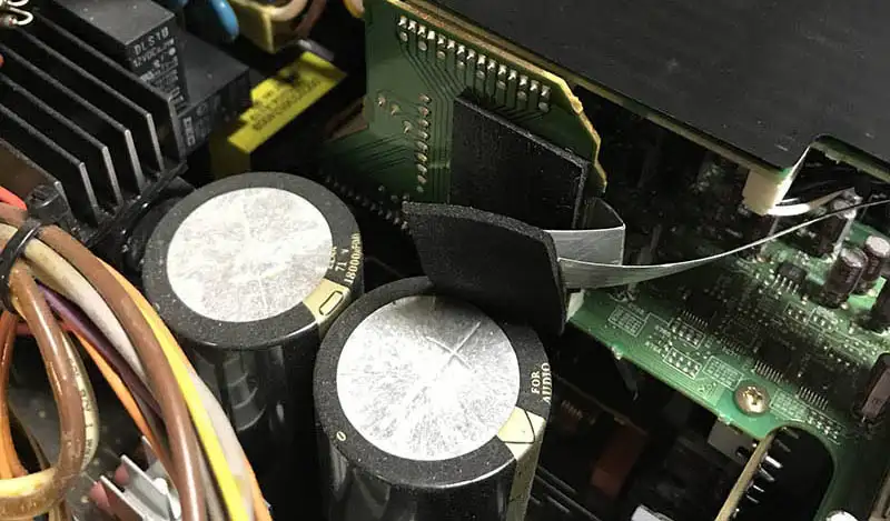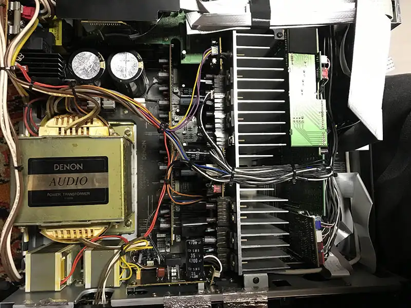 BELOW: The build quality is high with audio-grade capacitors throughout. The power supply makes up a left side of the interior with output transistors visible down the center. Note the factory metal tape at the bottom edge to reduce static. The audio boards on the far right are removable but are buried under several web cables and connectors. |