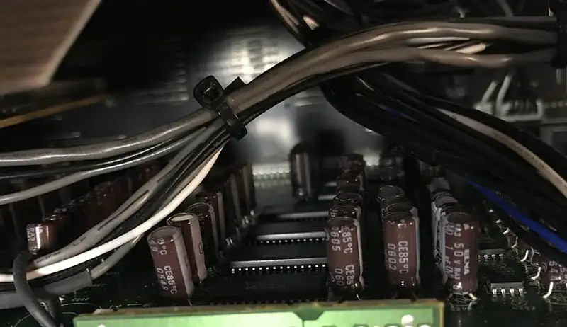 BELOW: The unit is filled with web cables of all sizes and shapes. Behind the main pair of "Elna for Audio" 18,000uf 71V caps one web had come loose. I glued it back in place. |