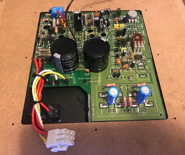 BELOW: this is the backside of the heatsink. The main power supply caps are 10,000 63V Gemcon. The blue pair are 220 35V NP. Several higher wattage resistors are situated above the board. From the unused holes in places it looks like this board was used in several different sub models. Everything was clean and tidy, no overheated parts or issues.
