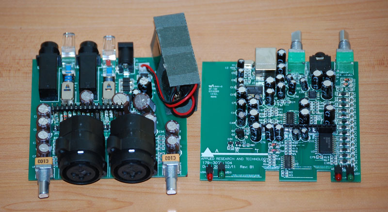 You'll notice that there are two circuit boards held together by a pin connector down the center. The pins were gold plated on mine which shows the quality of this unit. The two boards pry apart easily.I was unable to find a schematic for this so I decided to keep it simple and spot obvious things to be done. Following the signal...the left board handles the input from the microphones and contains the power supply so this is a good place to start. The right board contains several chips and the USB circuit. The photo below is after I modified the input board.