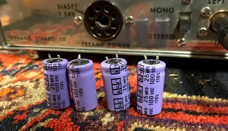 The capacitors used by Klipsch for many years have been the "KSC" brand made by the King-Sun company of China. I've always thought it was unusual that Klipsch never supplied their own in-house brand of capacitors, but Paul Klipsch must have determined that KSC mylar caps provided something he liked. Since the crossovers were dialed in based on the resistance of the KSC caps, be aware that switching the film caps out to lower ESR polypropylenes can have the effect of altering the frequency response. Below are the 27 year old electrolytic caps from my KG1 crossover (two per woofer). I measured them at 27.4, 27.7, 27.3, and 26.6uf which is high but still within 10% after 27 years. However just because it measures fine on a meter doesn't mean it responds properly to a musical signal. Time to swap them out. |