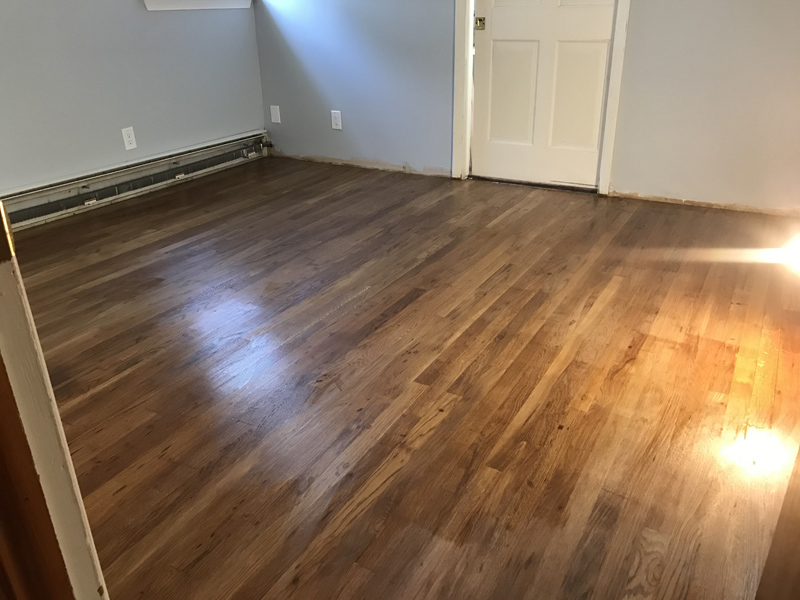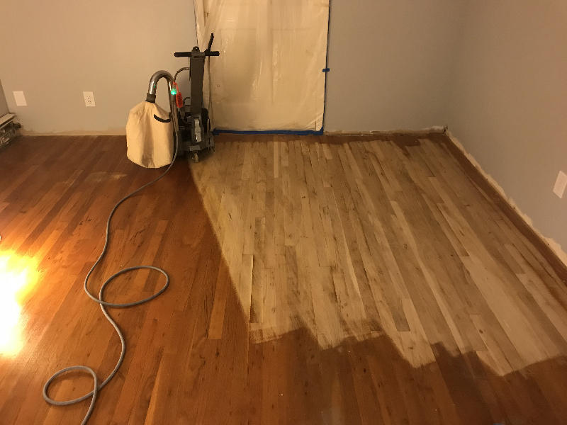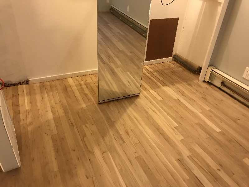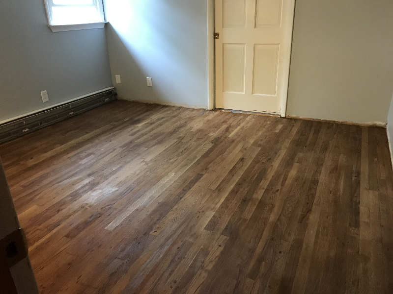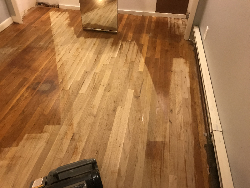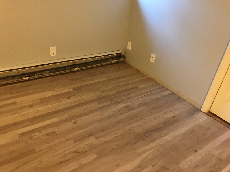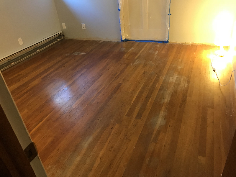 BELOW: This is after I went around the perimeter with a hand-held orbital sander in three passes using 36/80/100 grit. I used a scraper in the corners and in the closet. This final cleanup and sanding out of small details took me a couple of hours.