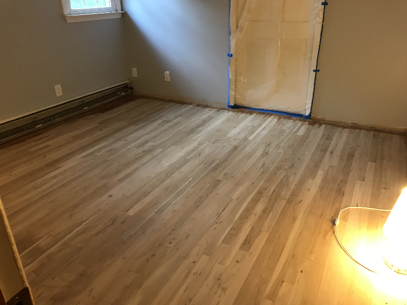 This let me clip on 3M sanding sheets and scuff as I walk around the room. The finish was hard and I scuffed moderately in line with the boards to level the surface and take off any bubbles or high spots.