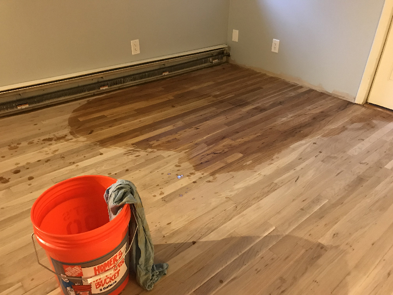 After sanding wood the grain tends to be "closed" and resists accepting stain. The solution is "water popping". By wetting the floor it opens up the grain allowing stain to more easily soak in. All I did was get a bucket of warm water and wipe a wrung-out rag across the floor. The water soaked in immediately...I didn't let it pool I just wiped until the wood was dark and then moved on.