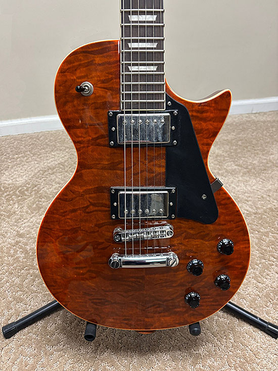 ![]() The quilt tiger-eye top and inlays closely resemble a Les Paul Supreme |