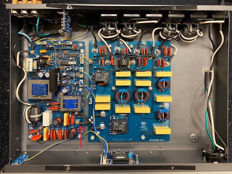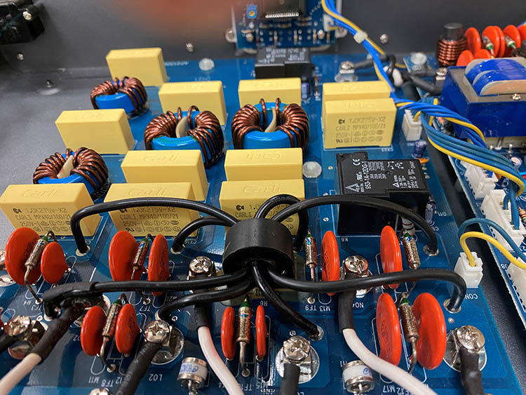 A closeup reveals X2 caps, coils, and orange MOVs. The small silver components between the orange MOVs are thermal fuses. The use of multiple Stage 1 filters and attention to detail and layout is top notch in my opinion |