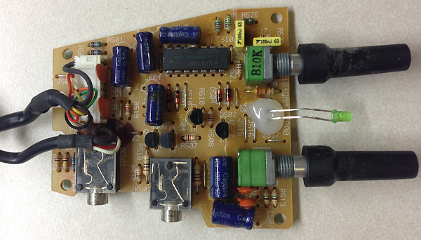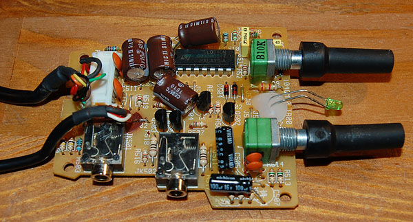 inside a case...but this is the first time I've ever seen separate pairs soldered this way. I'm guessing it was for space considerations. The other two caps are 100uf 16V. A TLO74CN low-noise JFET op amp and assorted resistors, diodes, etc, round things out.