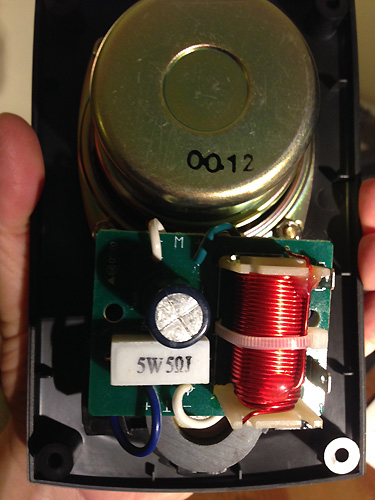 A generic "CAPEX" 4uf 100v NP electrolytic cap is used on the tweeter. While this cap isn't audiophile quality for a small computer speaker it's acceptable. However, I measured them at 4.75 and 4.83uf which is close to 20% out of tolerance, not good. A 5 ohm 5W resistor pads the tweeter. An iron-core inductor is used on the mid-woofer.