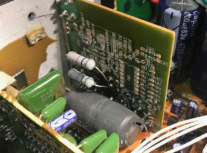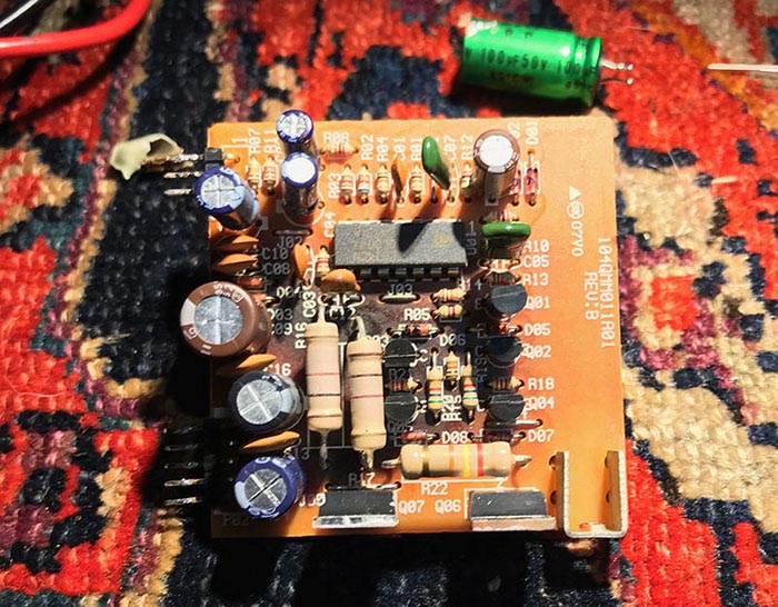 To remove the board I had to unsolder its pins from the board next to it. While I had it out I replaced the electrolytic caps with either Elna Silmics or Nichicon VRs depending on what would fit (same values).