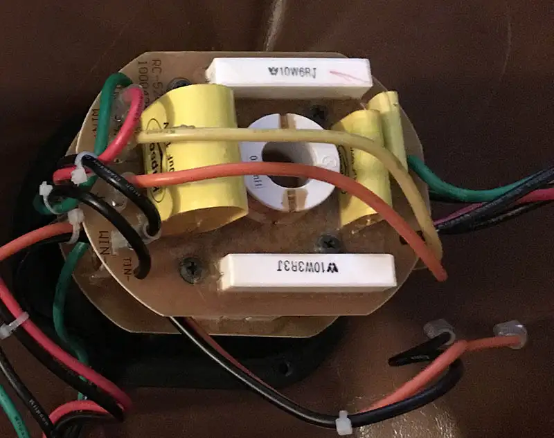 Below is the crossover in my original RC52. For such a simple speaker this is surprisingly complex. It has a two level design with a total of 5 resistors, 2 iron core coils, one air coil and 4 film capacitors. The wire is heavy gauge stamped "Klipsch custom high frequency wire".