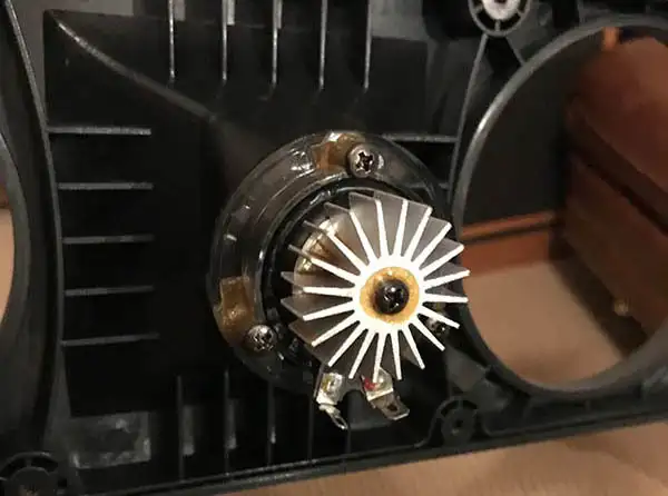 BELOW: the faceplate unbolts to reveal a horn tweeter with an interesting heat sink. Each end of the faceplate has an oval woofer port tube extending into the cabinet that appears to be the secret to producing strong bass.