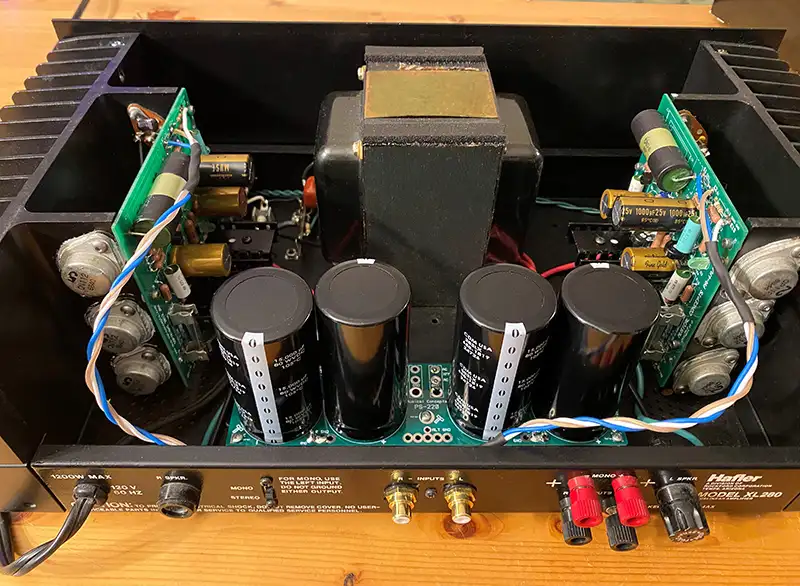 In the early 2000s I was constructing a new home theater and decided I wanted a mono center-channel Hafler. I could have used a stock XL280 in mono mode by flipping the factory switch on the back. But I worried about the accuracy of summing two channels to combine the waveforms especially if the original boards were old and out of spec. The other option was to only use one channel. But that felt like cheating by using half of a stereo amp. I decided it made more sense to have the entire power supply and transformer feed one channel in true mono fashion.