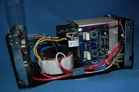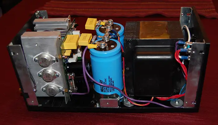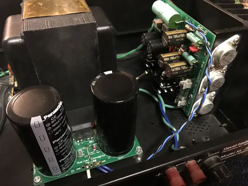 BELOW: Later I upgraded the boards to Musical Concepts PA-4 versions. The power supply became a PS200 with an IXYS 600V rectifier. Input wires are Mogami W2549. |